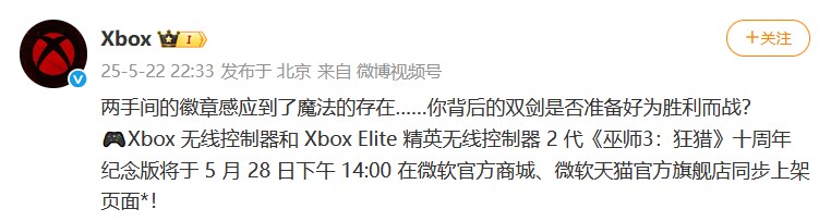 今日,下午2點,《巫師3:狂獵》十週年紀念版Xbox手柄在國內開售。