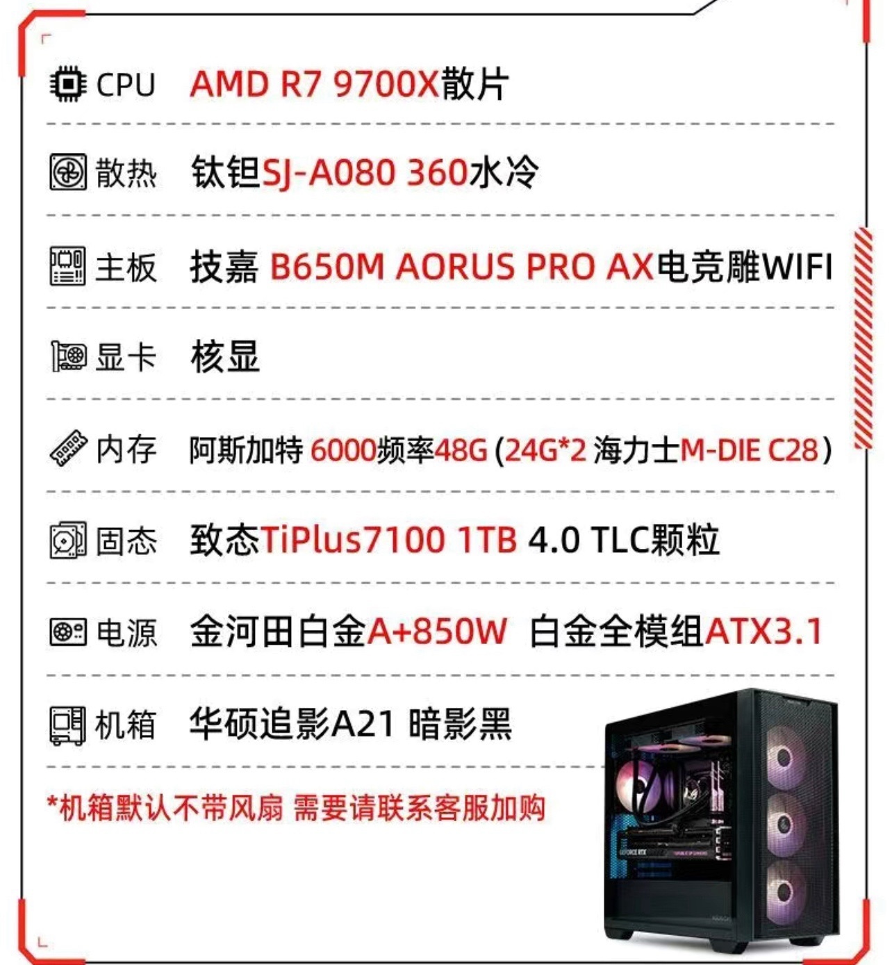 这套机子是昨晚看到的盒友在某万粉大佬网店那里买到的,我也不敢说是谁怕被粉丝冲烂。实物图和例图不说风马牛不相及也只能算是毫无关系了。抛开图片与实物不符不说,风扇位置也很奇怪,如果预算只能给到两个风扇那为什么不放在上面做个出风口呢?放在侧面进风除了好看外我想不到原因,况且算了一下利润并不至于到只能给2个风扇的程度。