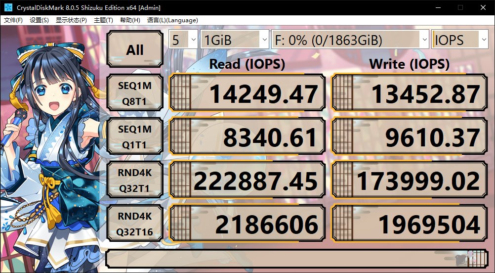4K随机读取速度为2186K IOPS,1M随机写入速度为1969K IOPS。