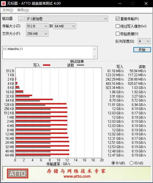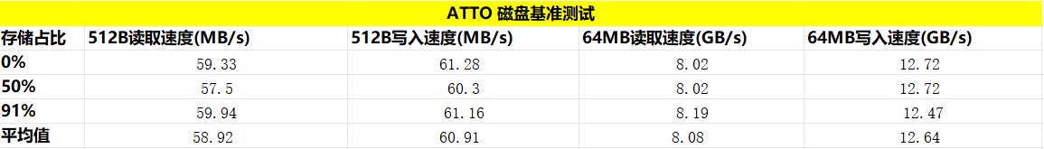 在ATTO 磁盘基准测试中,小文件的读写速度在60MB/s左右,但是大文件的读写速度差距有点大,其中64MB大文件的读取速度偏低,在8GB/s以上,而写入速度在12GB/s以上。