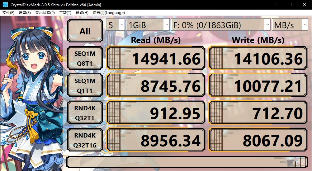 2TB版本最大顺序读写速度分别为14900 MB/s和14000 MB/s,最大随机读写速度分别为2300K IOPS和2400K IOPS。