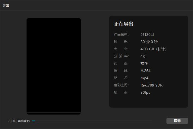 除此之外再试试生产力方面的表现如何,将一份30分钟4GB大小的视频素材,以4K分辨率、30FPS帧率导出,仅花费5分钟即可完成操作。