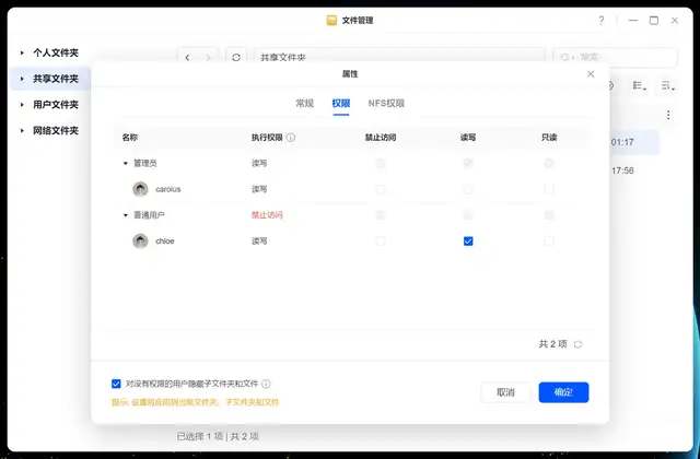 在权限里面,拥有个人与用户组两个方式。当用户的个人权限与所在用户组的权限发生冲突时,系统遵循权限优先级规则:“禁止访问 > 读写 > 只读”,确保权限管理的一致性和有效性。