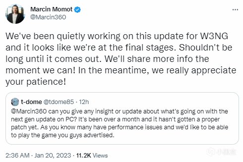 “我們一直在默默地爲《巫師3》次世代版進行升級,目前正處於最後收尾階段,用不了多久就會推出”
