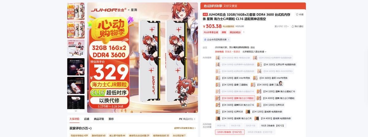 作爲DDR4的末代王者, 玖合星舞系列內存條採用海力士CJR顆粒,具備CL16超低時序,遊戲延時不輸中端DDR5內存。同時,它還具有一定的超頻潛力,將其頻率進一步提升至 4000Mhz,從而獲得更高的內存帶寬和更低的延遲。618大促期間極具競爭力,疊加優惠後僅需300 元出頭,性價比極高!