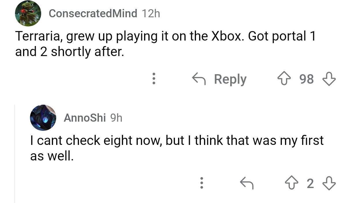 泰拉瑞亚 (Terraria),在Xbox上玩着它长大的。之后不久就玩了传送门1和2