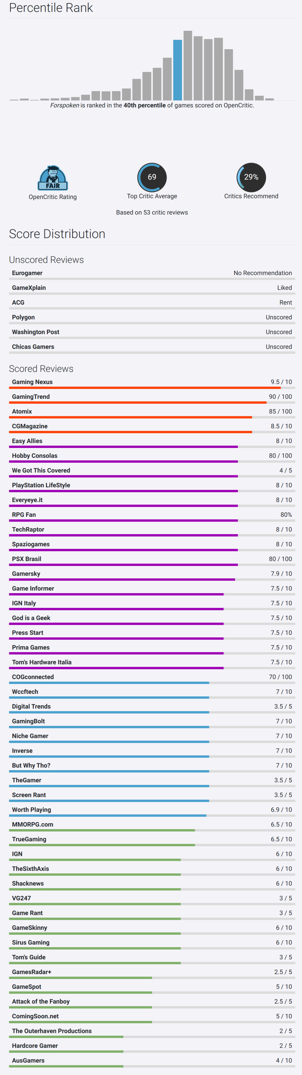 OpenCritic 收錄 53 家媒體,均分爲 69 分,推薦率 29%。