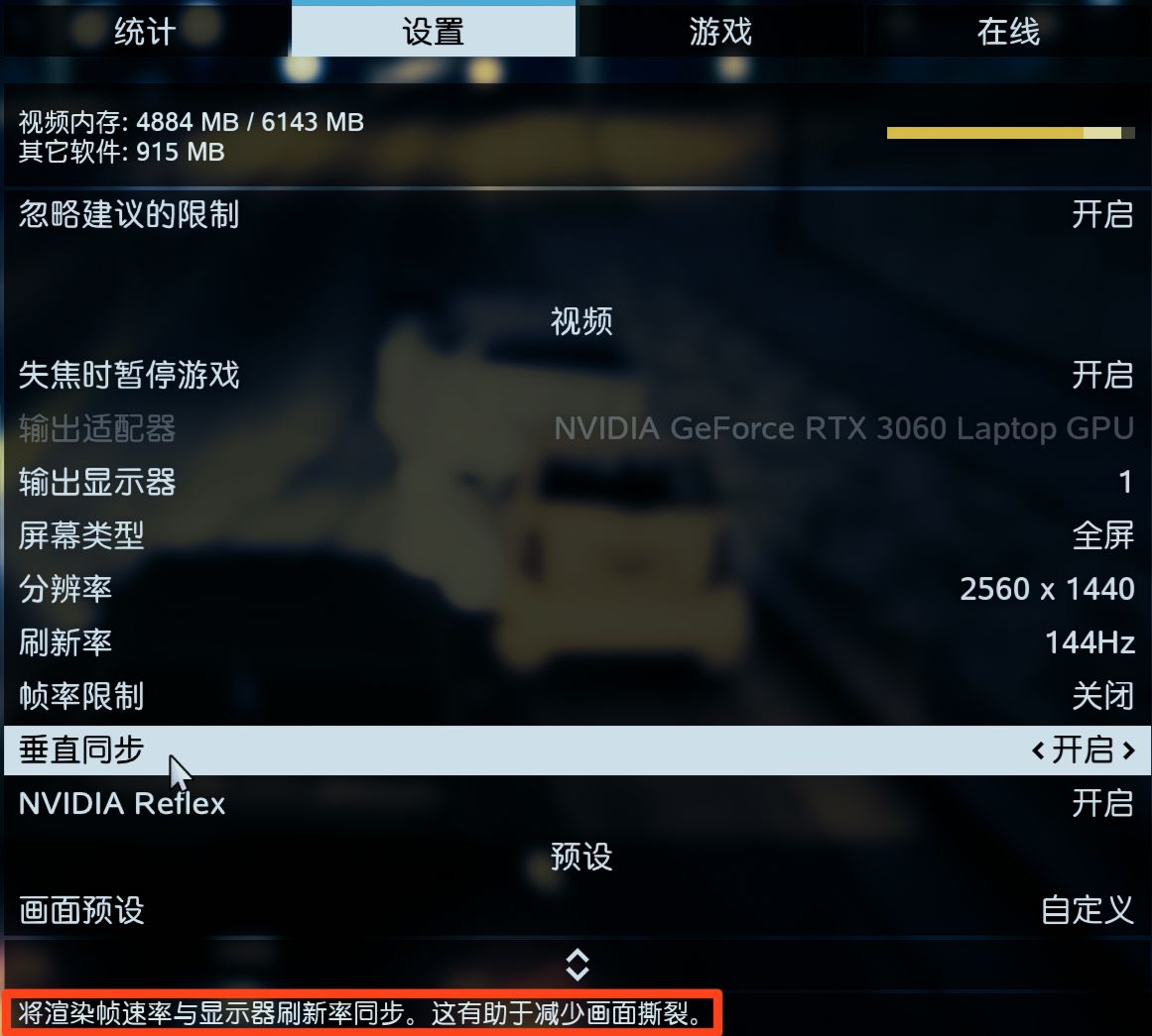 “垂直同步”可以让游戏的渲染速度放缓一些,让“帧”依次排队显示。经过实际游玩感受+观察帧数和1%Low帧波动,开启后可缓解顿挫感。1%Low帧经常保持在刷新率的一半,例如我的显示屏刷新率是144Hz,Low经常保持在72,在卡顿时也只会跳到36左右,可以减少游戏卡顿感。