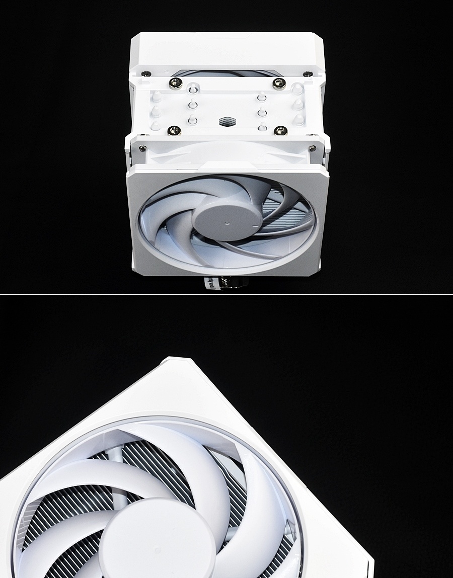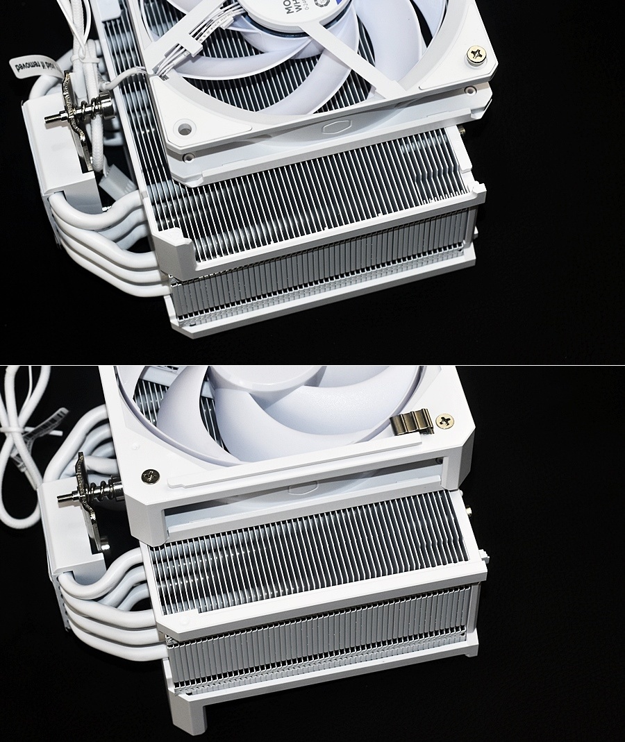 可以看到酷冷至尊HYPER 612 APEX WHITE前後兩個散熱風扇的固定方式也是有所不同,一個爲螺絲一個爲金屬彈片+凸形長條,非常聰明且實用的設計。