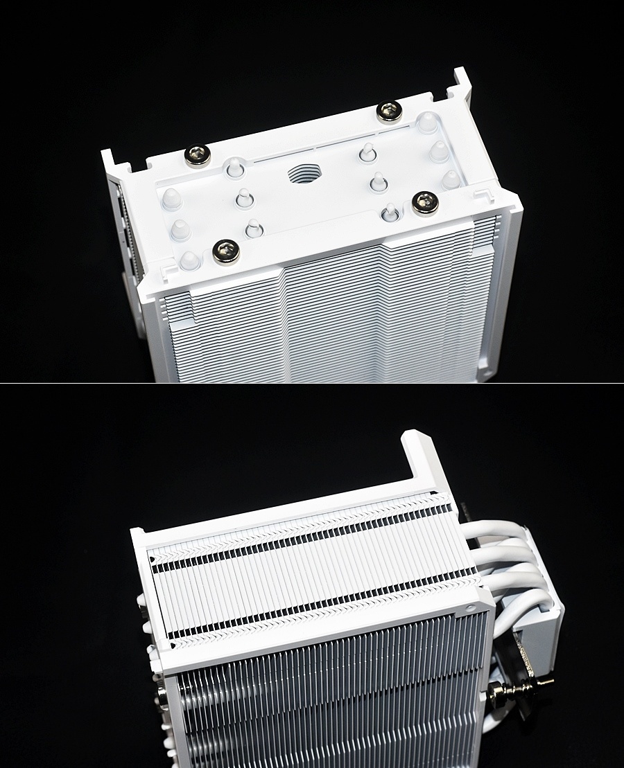 可以看到酷冷至尊HYPER 612 APEX WHITE的熱管部分,採用了當下的後傾斜設計,也就是是內存避讓,對於電競RGB內存的高馬甲兼容性非常友好,讓光效一覽無餘。
