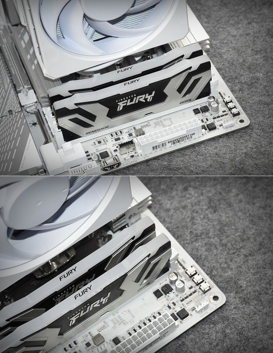 這裏使用的內存爲Kingston FURY Renegade叛逆者DDR5 CUDIMM RGB內存,頻率爲8400MHz,長爲133.35mm,厚爲7.66mm,高爲45mm。酷冷至尊HYPER 612 APEX WHITE輕鬆兼容。