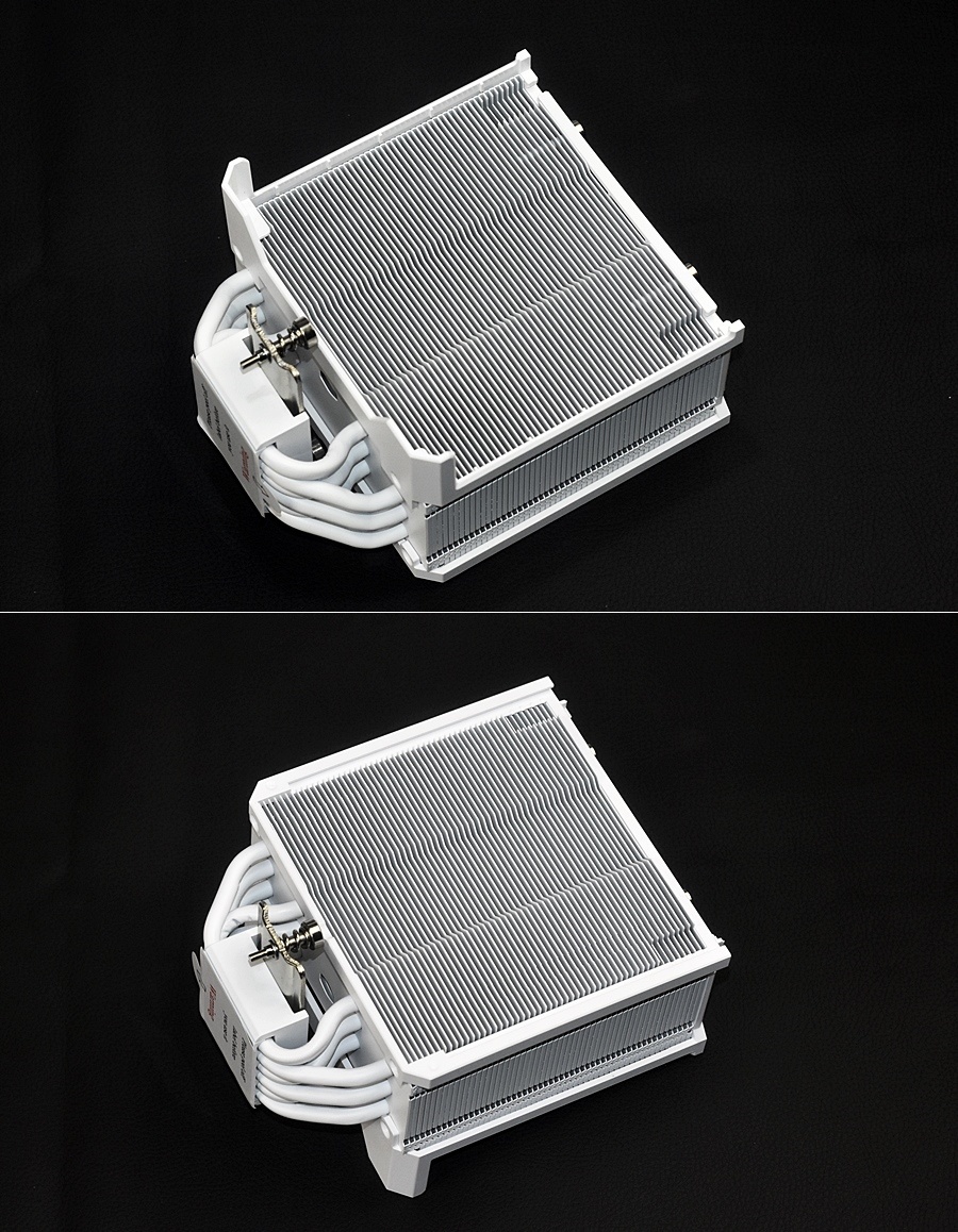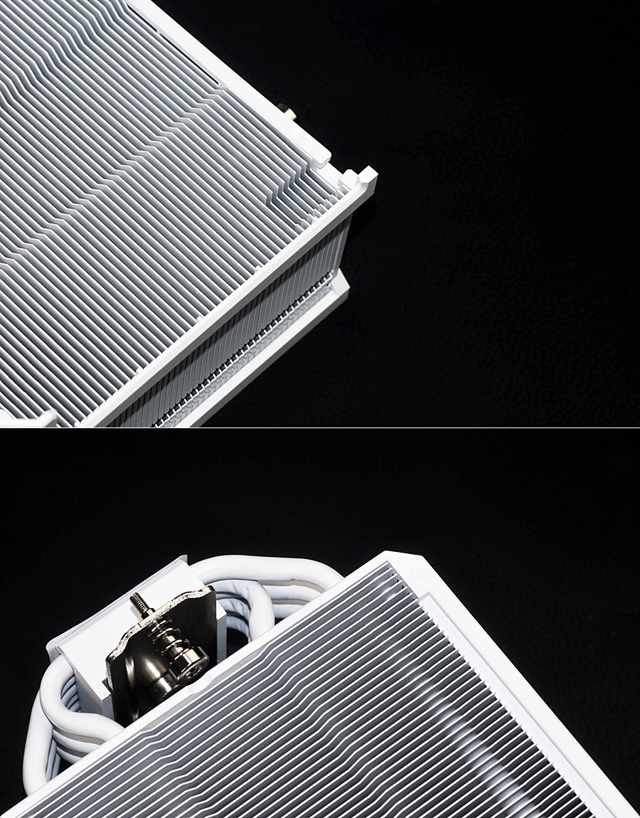 塔身側面特寫,可以看到酷冷至尊HYPER 612 APEX WHITE爲單塔設計,側面的散熱鰭片爲折FIT設計排列整齊,白色漆面工藝優良。