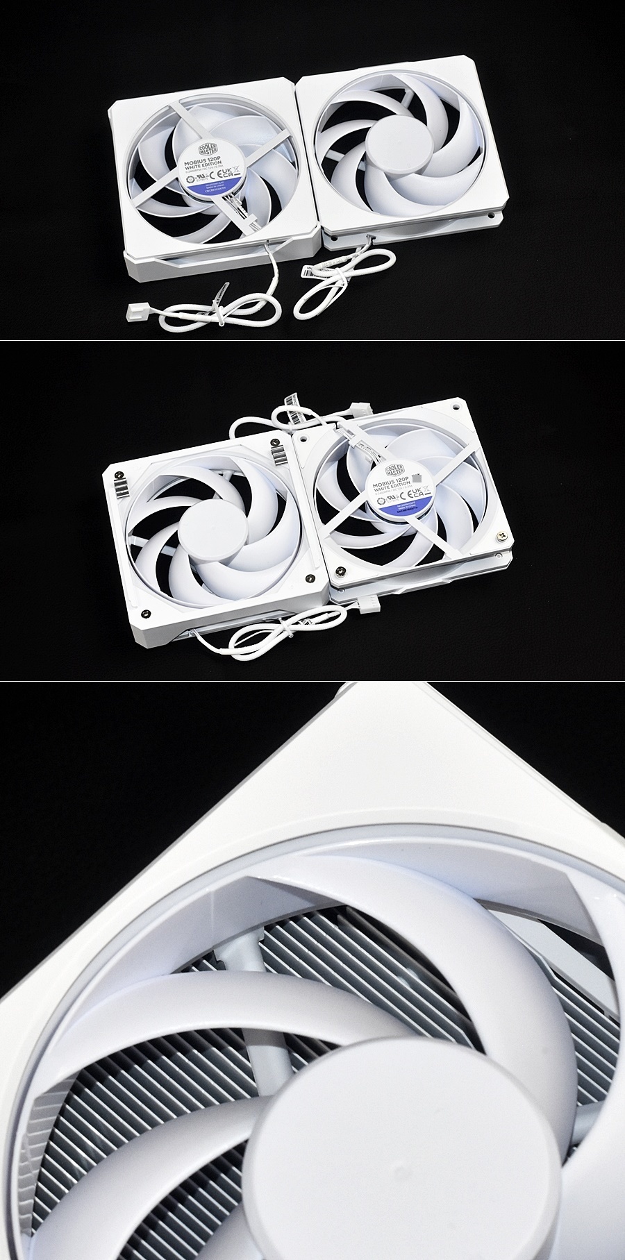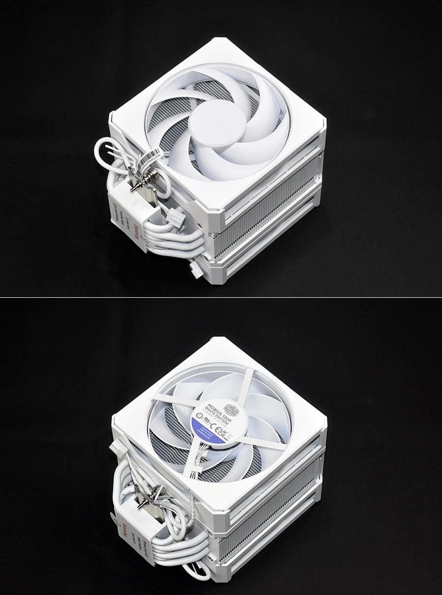 酷冷至尊HYPER 612 APEX WHITE標配兩把MOBIUS/莫比烏斯 120P WHITE EDITION無光版散熱風扇:尺寸120mm x 120mm x 25mm,採用環形動態軸承,風扇轉速0-2400 RPM±10%,風量127.6m³/h(75.2 CFM),最大風壓3.63mmH2O,MTTF大於200000小時,最大噪音值30 dBA,環形動態軸承,供電接口wei 小4pin支持PWM,額定電壓12V,額定電流0.18A,安全電流0.35A,功耗2.16W,質保五年。