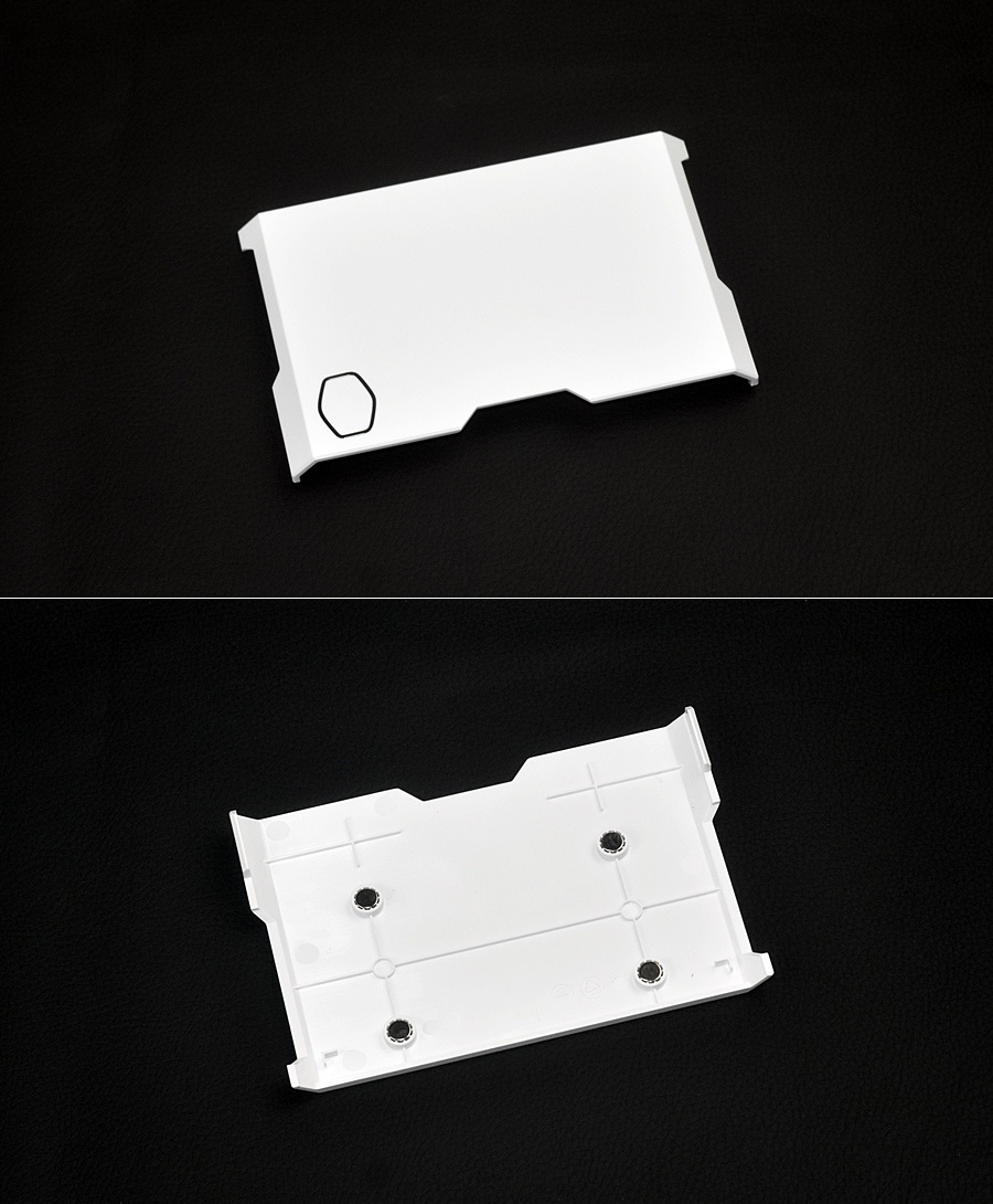 酷冷至尊HYPER 612 APEX WHITE磁吸式頂蓋正反兩面特寫,頂蓋背面中間安排有四顆獨立小磁鐵,磁吸力量適中不會過緊也不會過鬆。