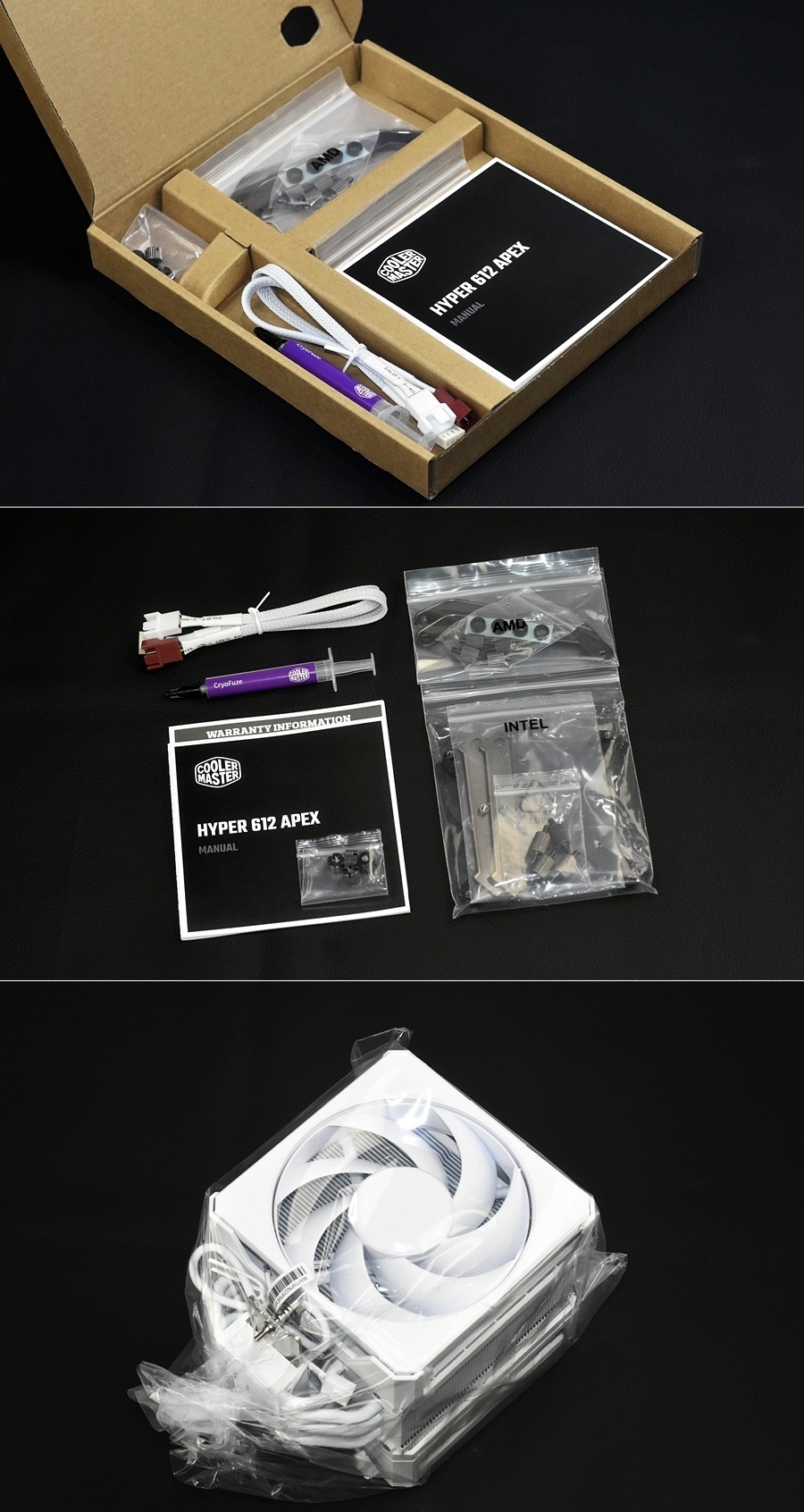 配件盒打開,當然就是一大堆配件啦:紙質使用指南、硅脂一管、轉接線、螺絲+扣具,酷冷至尊HYPER 612 APEX WHITE本體被透明保護袋包裹。