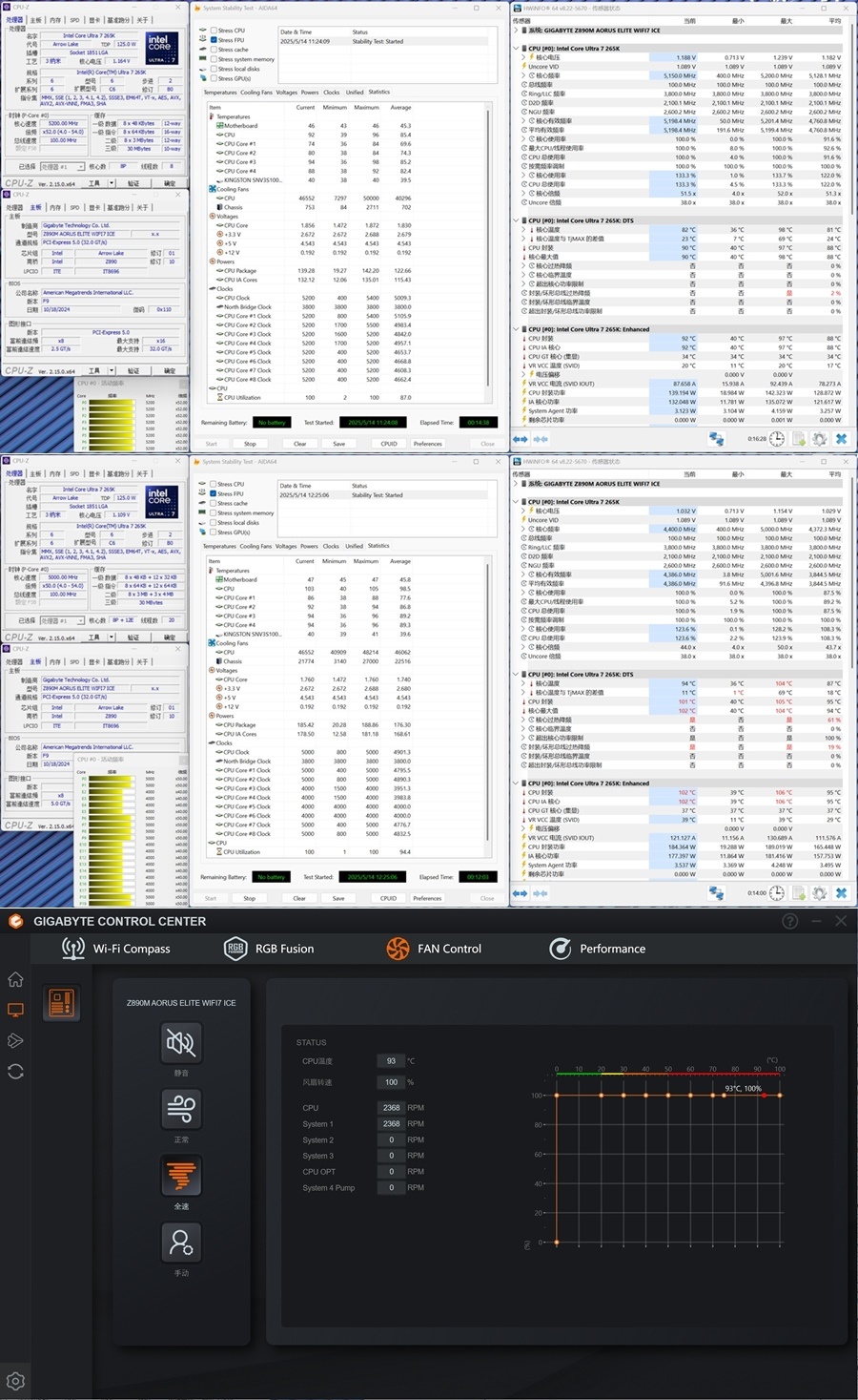 開放式測試環境,室溫29度左右,風扇拉滿全速,轉速2368RPM,CPU爲265K。