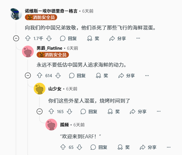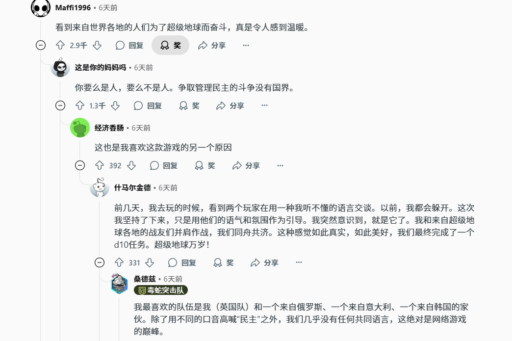 在战斗之中,中国和外国的地狱潜兵们不仅通力协助,更是互相之间取得了信任与敬意,在红迪上还衍生出了一个词:super china。