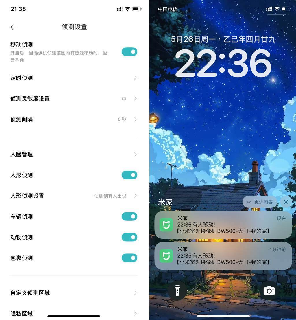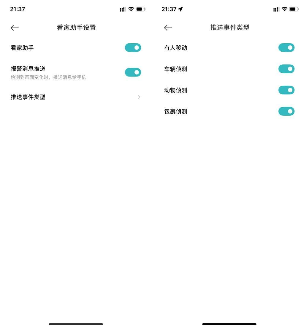 進入看家功能後,可以選擇不同的事件類型,包括有人移動、車輛偵測、動物偵測和包裹偵測。設置完成後,檢測到畫面變化時會自動推送通知到手機。
