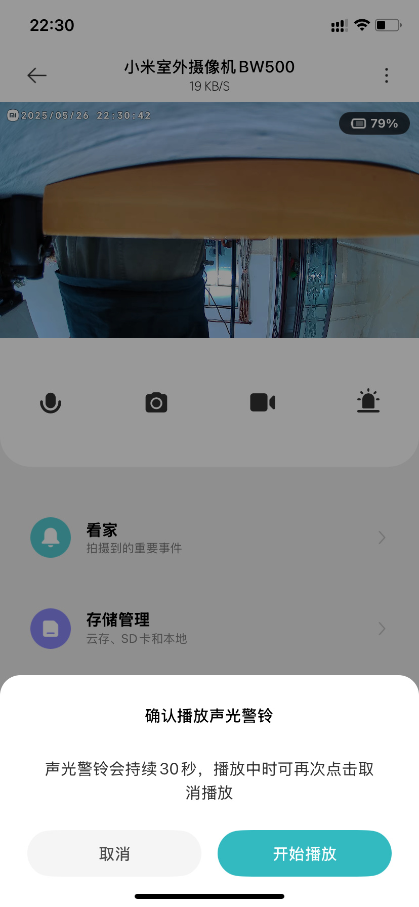 進入APP後,可以查看實時畫面,右上角顯示當前電量。下方是功能選項,包括燈光手動開關、聲音開關、語音、截圖、錄製視頻片段以及警示功能。底部是看家和存儲管理界面,簡潔易懂。