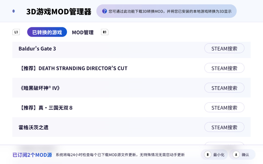 一开始,我主要集中体验了几款适配优化过的游戏,如《只狼》《上古卷轴5》《辐射4》等。系统里自带了一个“3D游戏MOD管理器”,能自动为Steam和Wegame的游戏安装补丁,列表目前一共有几十款已优化产品,较新的大作有《黑神话》《暗喻幻想》《装甲核心6》《匹诺曹的谎言》等。