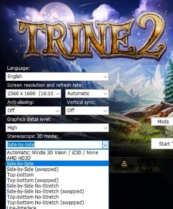 我还专门把当年的《三位一体2》也下载回来了,这是当年英伟达 3D Vision主推产品之一,游戏启动器原生支持各种格式的3D显示。《三位一体2》刚发售的时候,我对其效果好奇已久,能看出游戏为3D特化了不少内容,用普通显示器玩总感觉少了点什么。