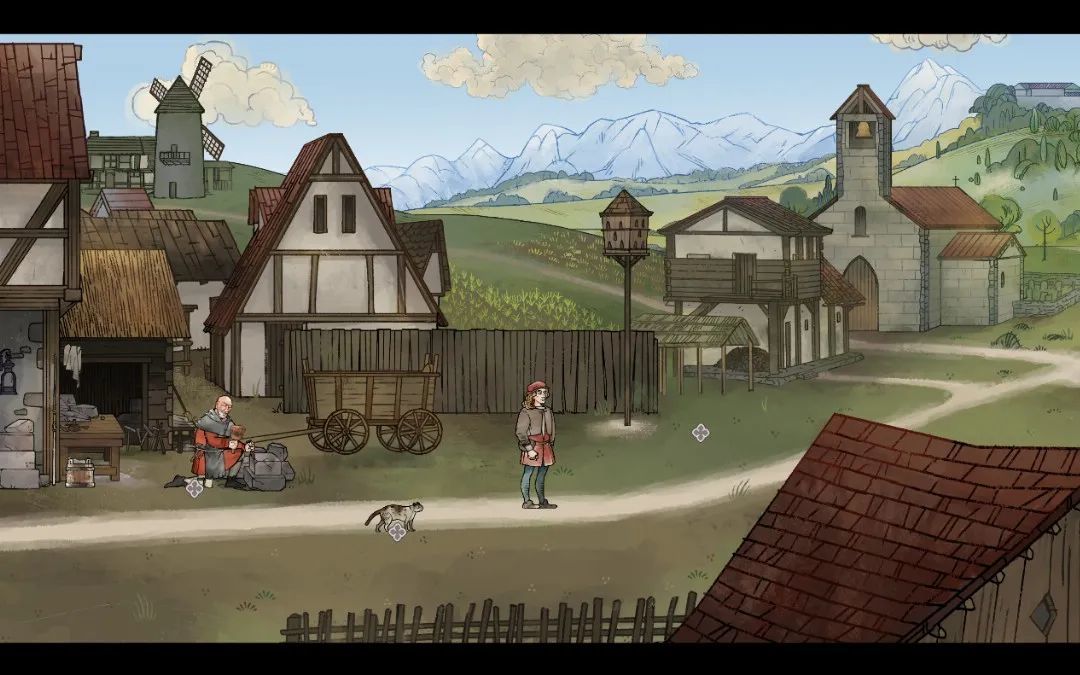 比如Pentiment的这个场景中(下图一),开启AI 3D后,近景的人物和房子,中景的建筑和草地,远处的山峦,都被准确清晰地裸眼3D化,实际观感有点像小时候玩的3D书(下图二)。
