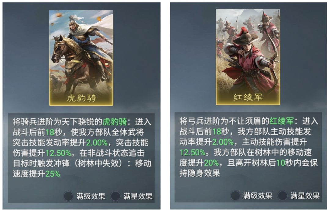 SLG兵種通常只有剋制關係和數值區別,比如槍兵克騎兵,弓兵傷害高、防禦低;但我們的特殊兵種可以在玩家的操作下發揮出更多特性,例如虎豹騎可以通過“鎖定敵人”提高移速,紅綾軍可以利用“進出樹林”提高輸出。