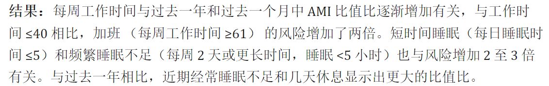[2]劉 Y, 田中 H;福岡心臟研究小組。日本男性加班、睡眠不足和非致命性急性心肌梗死的風險。Occup Environ Med. 2002 年 7 月;59(7):447-51.doi:10.1136/oem.59.7.447。PMID:12107292;PMCID:PMC1740308。
