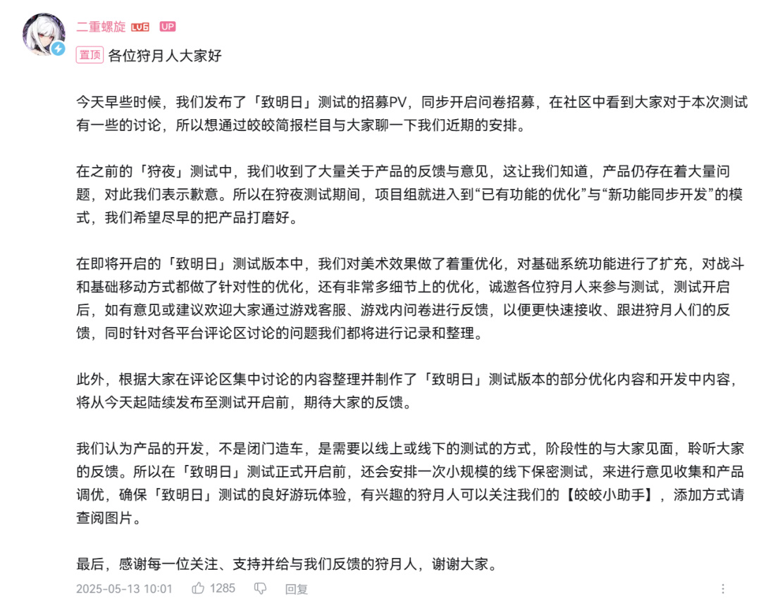 相较于玩法上的创新,《二重螺旋》的短板可能是首测表现出来的美术品质以及3C手感,距离头部产品还存在一定差距,官方也在6月测试的招募视频下着重提到了会在本次测试中提升美术品质、优化战斗手感。