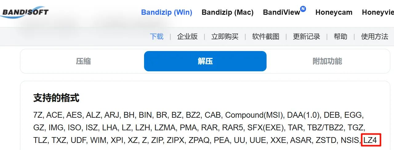 主流的解壓縮軟件中只有Bandizip支持解壓lz4格式壓縮包,7-Zip和WinRAR不支持。