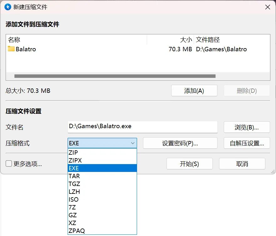 在壓縮設置界面,壓縮格式選擇EXE即可創建自解壓格式壓縮包,Android端ZArchiver Pro不支持。