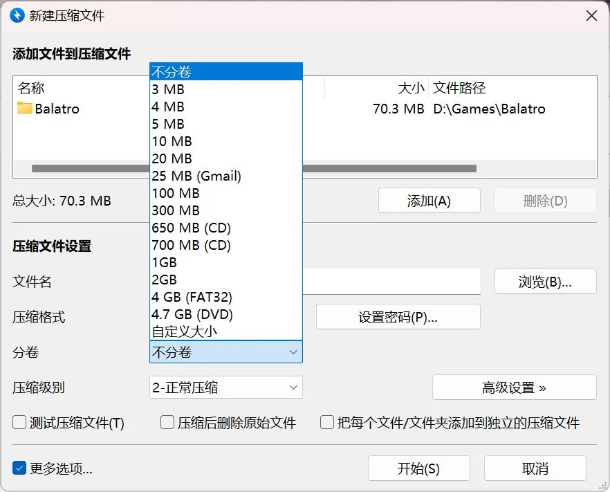 在壓縮設置界面勾選更多選項,設置所需要的分卷大小即可創建分卷壓縮包。一些平臺會限制上傳的單個文件大小,把單個大文件分成多個小分卷壓縮包上傳就能解決這一問題。