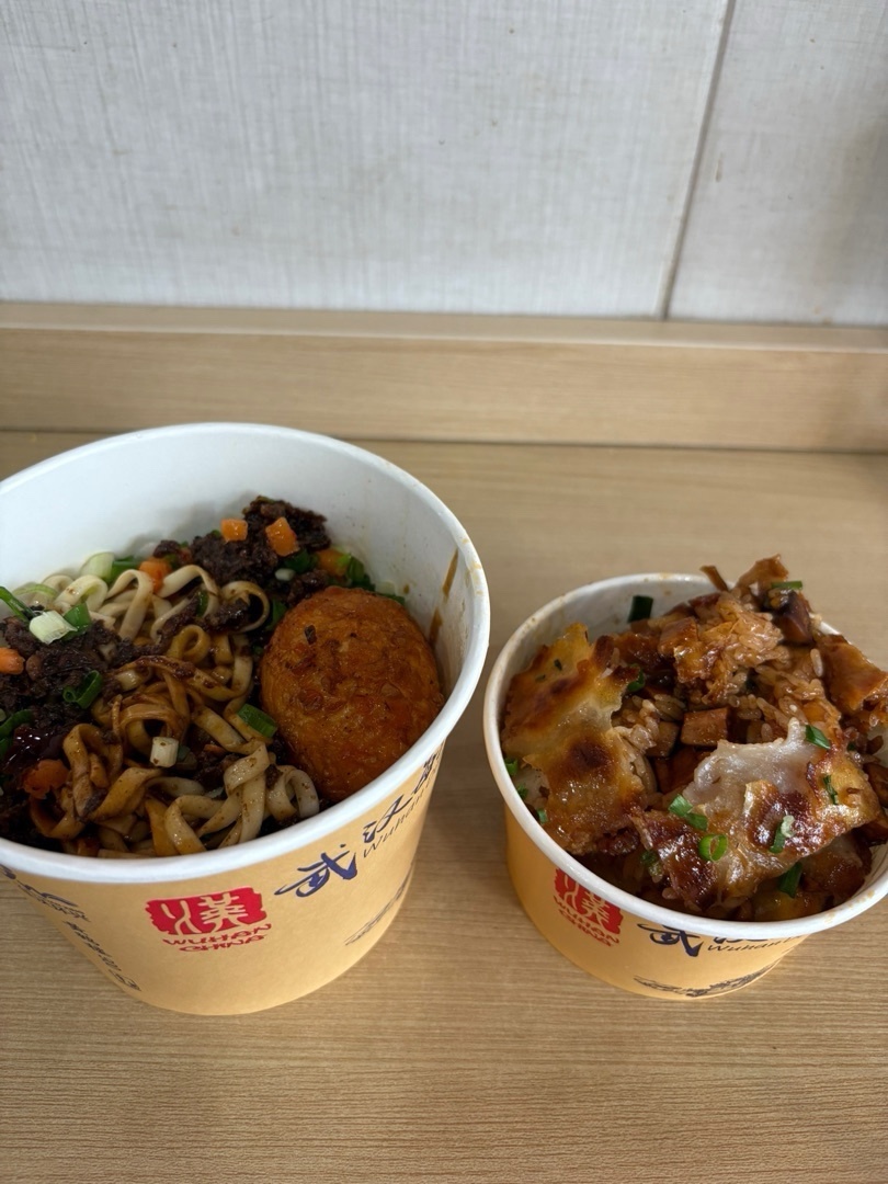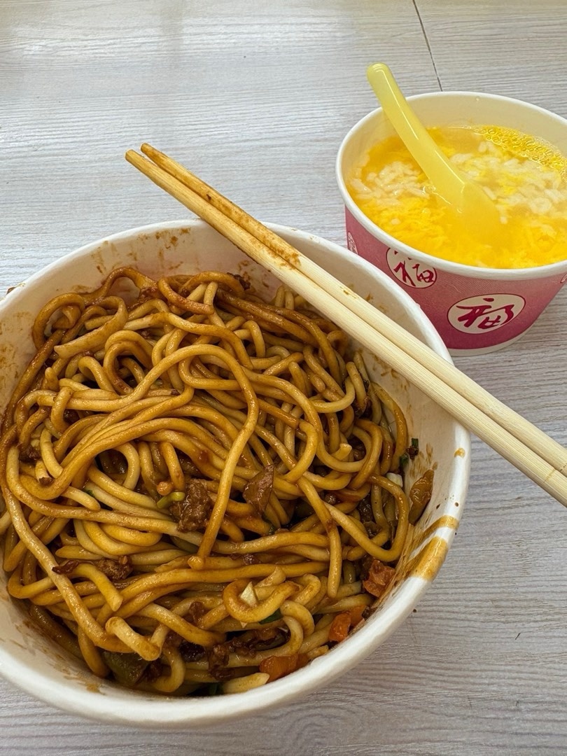 ★左边是炸酱面、右边是三鲜豆皮,大河一开始以为后者就是主食的配菜,完全没想到人家就是主食,属实大胃王行为了,炸酱面吃完了根本就吃不下了。