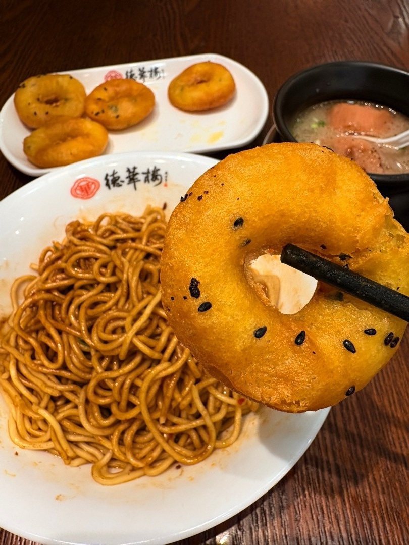 ★热干面、甜甜圈(面窝)、排骨莲藕汤,其他两个盒友应该都能想象出什么味道,这个面窝怎么形容呢,不知道你们有没有吃过炸洋葱圈,就差不多那种,但里面是有陷的,这种炸物吃两个以上就容易腻了。