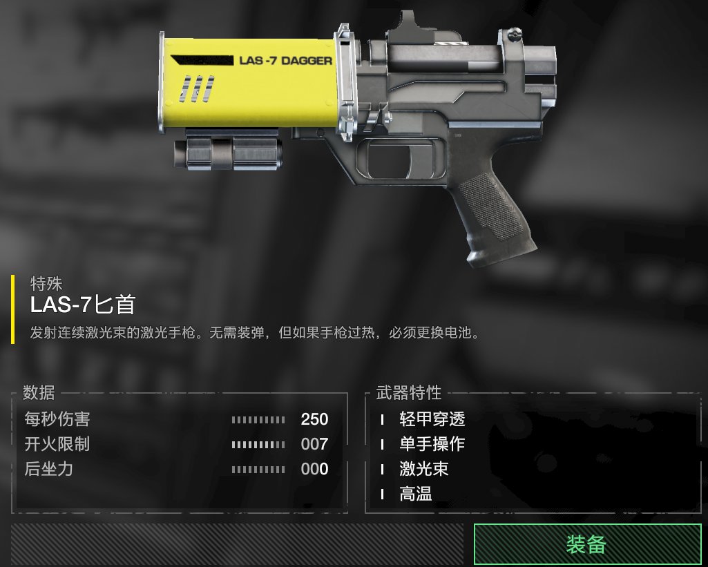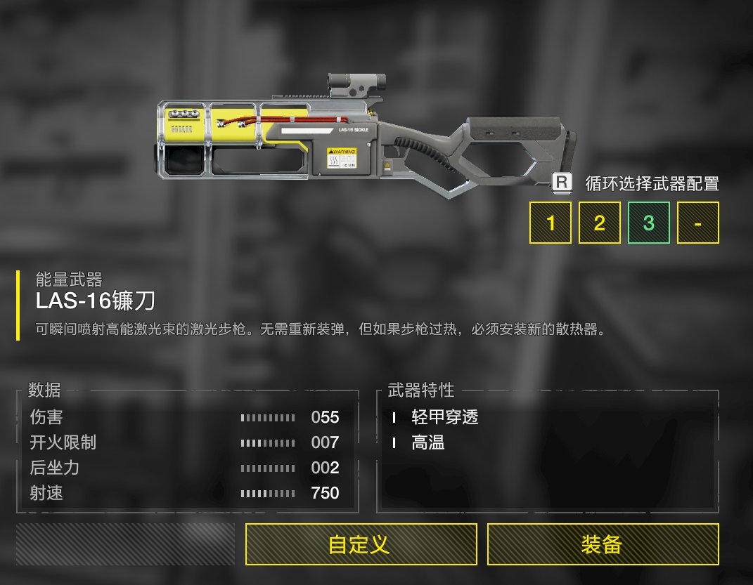 鐮刀,3發備彈,說實話不太好用,一直按住9秒就過熱了,數值給的太保守了。要說適用範圍的話估計只有西線和南線了。