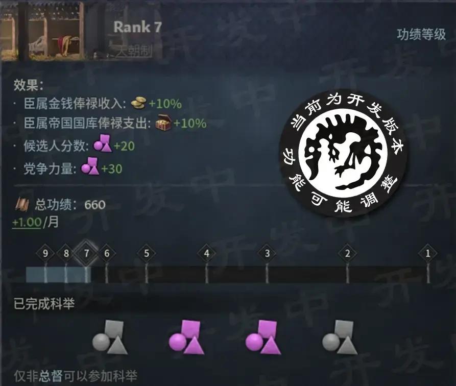 科舉這邊被標註爲活動,如果蠢驢有德的話會是在活動裏的盛大活動類型,定期(指冷卻),然後整體形勢類似比武大會,至於操控成爲統治者的類型則是一個非常利好玩家的機制。之前玩家普遍存在的一個痛點就是不好控制封臣的屬性特質等,或者說想控制非常廢手。現在有新機制還是可以期待一下的。
