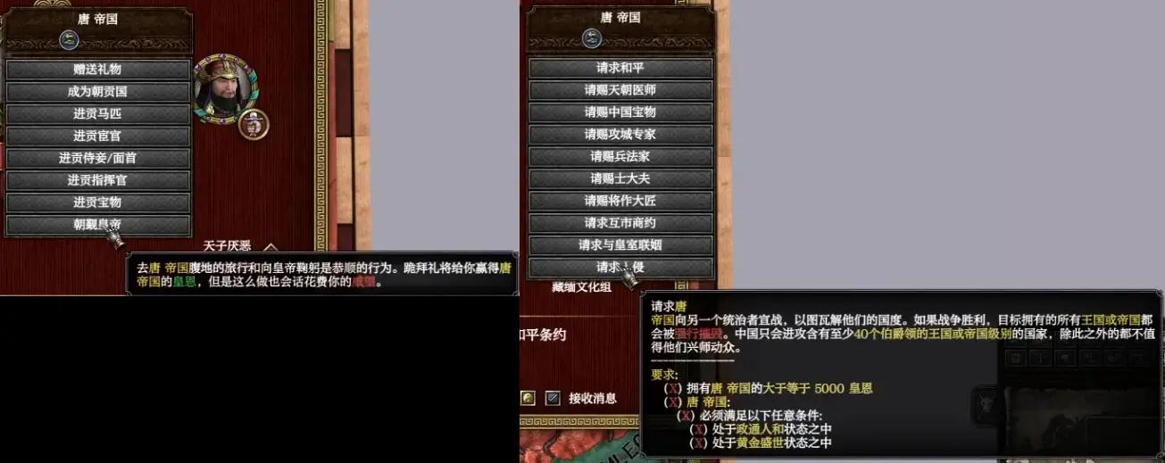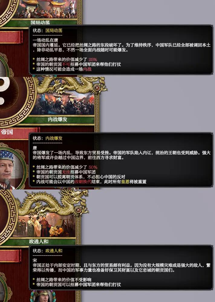 CK2 的政通人和等中華狀態也延續到了CK3中,但與CK3不同的是,CK2的各種狀態大都圍繞絲綢之路,以及帝國與朝貢國之間的互動所展開。CK3不僅保留了這些設定,而且還結合局勢機制,做出了更符合分久必合,合久必分的中華特色。雖然這個永不結束的鬥爭機制或許有些不妥的地方,但是相信在前兩次前車之鑑下,這次或許會比波斯做得更加有趣。會參與中華的戰爭,中華通常也不會保衛其朝貢者,但朝貢者遭受直接攻擊的可能性會更小。