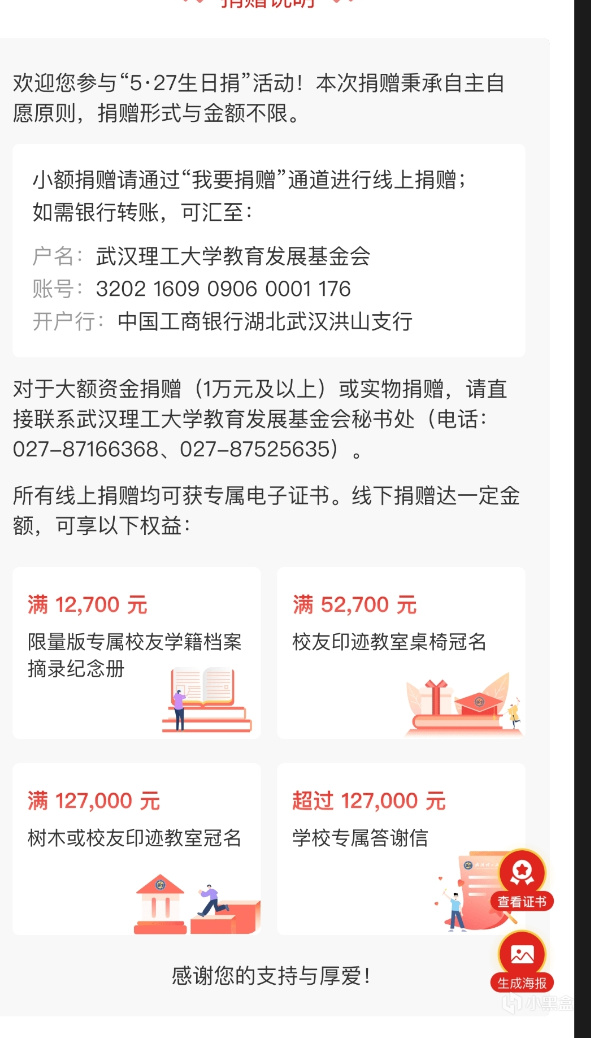 近日,武汉理工大学“5.27生日捐”引发关注,因其线上不论捐赠多少,均可获专属电子证书!不少学生仔网上晒出自己的捐赠证书!