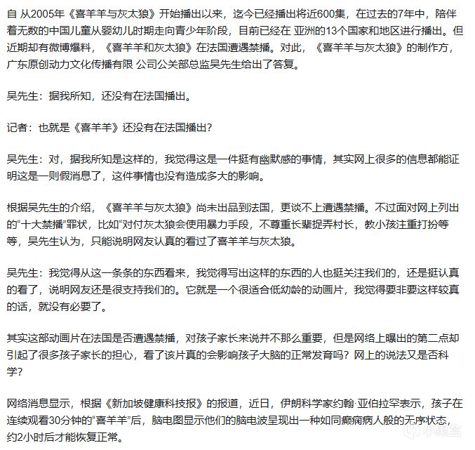 【實際情況】:2010年喜羊羊壓根沒在法國上映過,也沒有任何法國公司前來諮詢過,何來的禁播,而且法國如果禁播爲什麼會找伊朗專家站臺。更何況所謂的十大罪狀很多就是當年國內家長舉報喜羊羊的時候用的。
