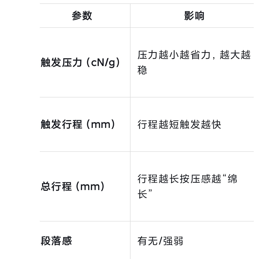 咱們發現了華點!無論叫“天外飛仙軸”還是“啥聲音都沒有軸”,核心參數(觸發壓力、行程、段落感)是基礎。