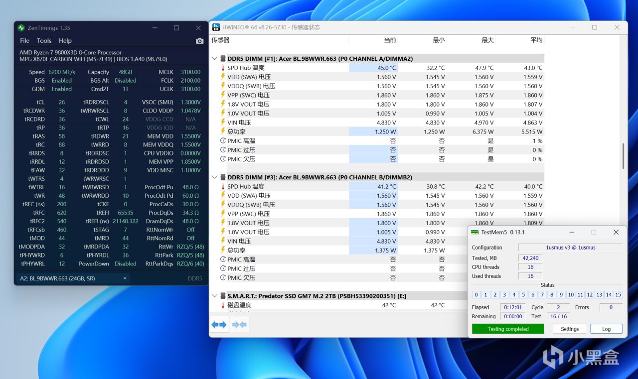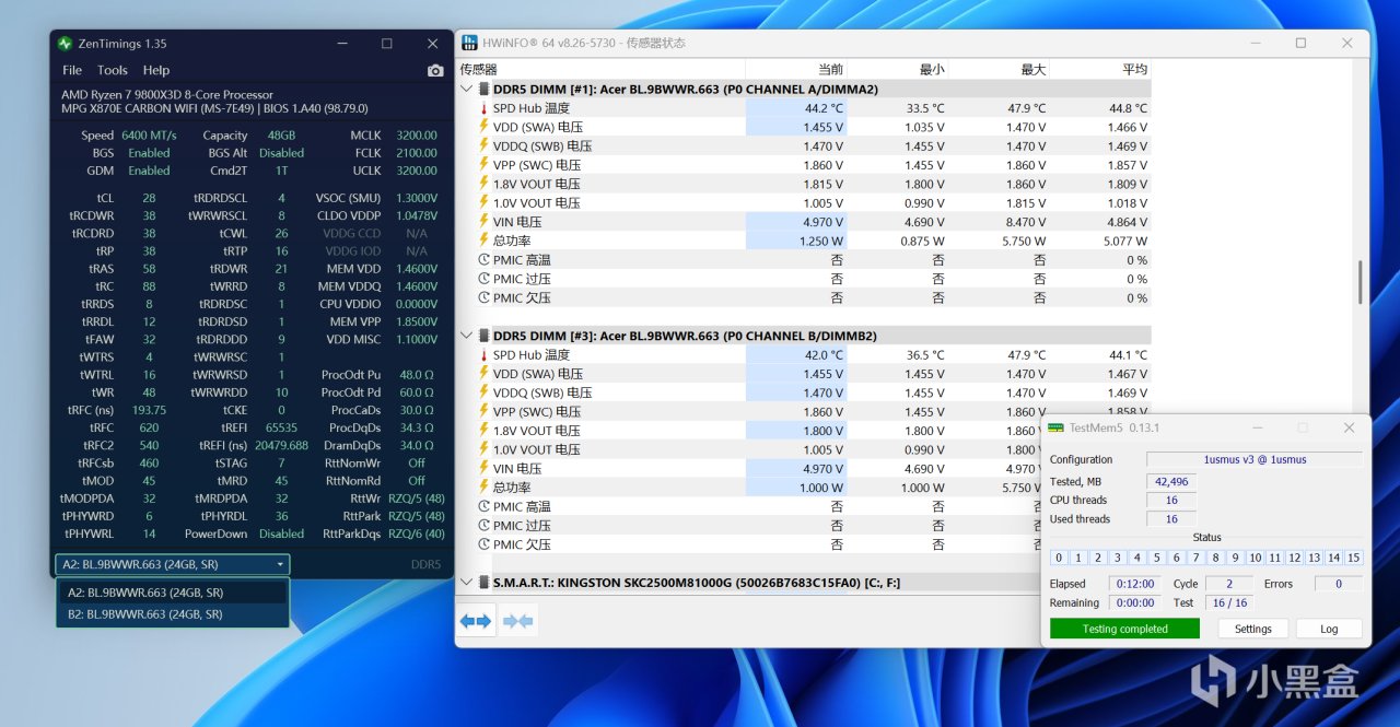按照惯例直接手动超频,一番折腾后这套影锋DDR5 6000C28 48GB能顺利小超至DDR5 6200C26-36-36-58,副时序和第三时序均可优化,唯一就是tRFC、tRFC2和tRFCsb这几个小参得比A-Die颗粒略高点,与此同时还能把FCLK总线频率超到2100MHz,不过因为CL值压得比较紧,内存电压得加到1.55V才可通过TestMem5烤机测试。