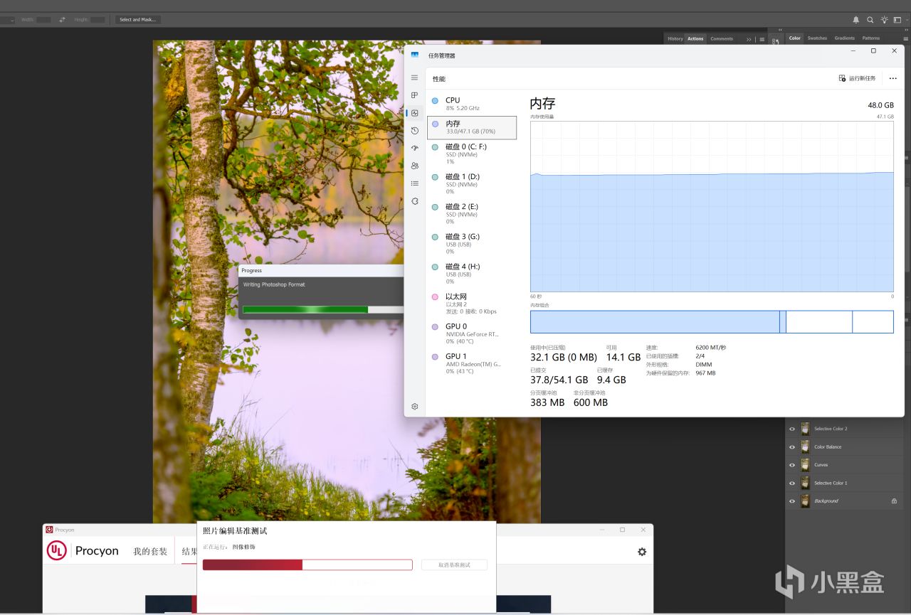 通过任务管理器我们可以看到,在UL Procyon照片编辑测试过程当中内存使用达到了32GB以上,可见48GB容量会更充裕,对于多图层、大型PSD文件处理更游刃有余,而且在实际的图像处理场景下,通常远不止单开一个Photoshop,肯定是越大容量越吃香~