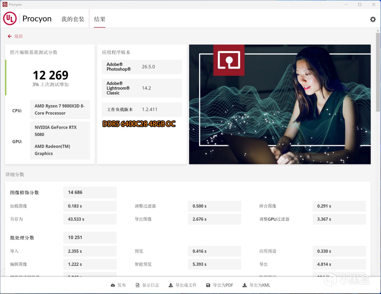 UL Procyon照片编辑,锐龙7 9800X3D+影锋DDR5 6400C28 48GB 手动超频得分12269