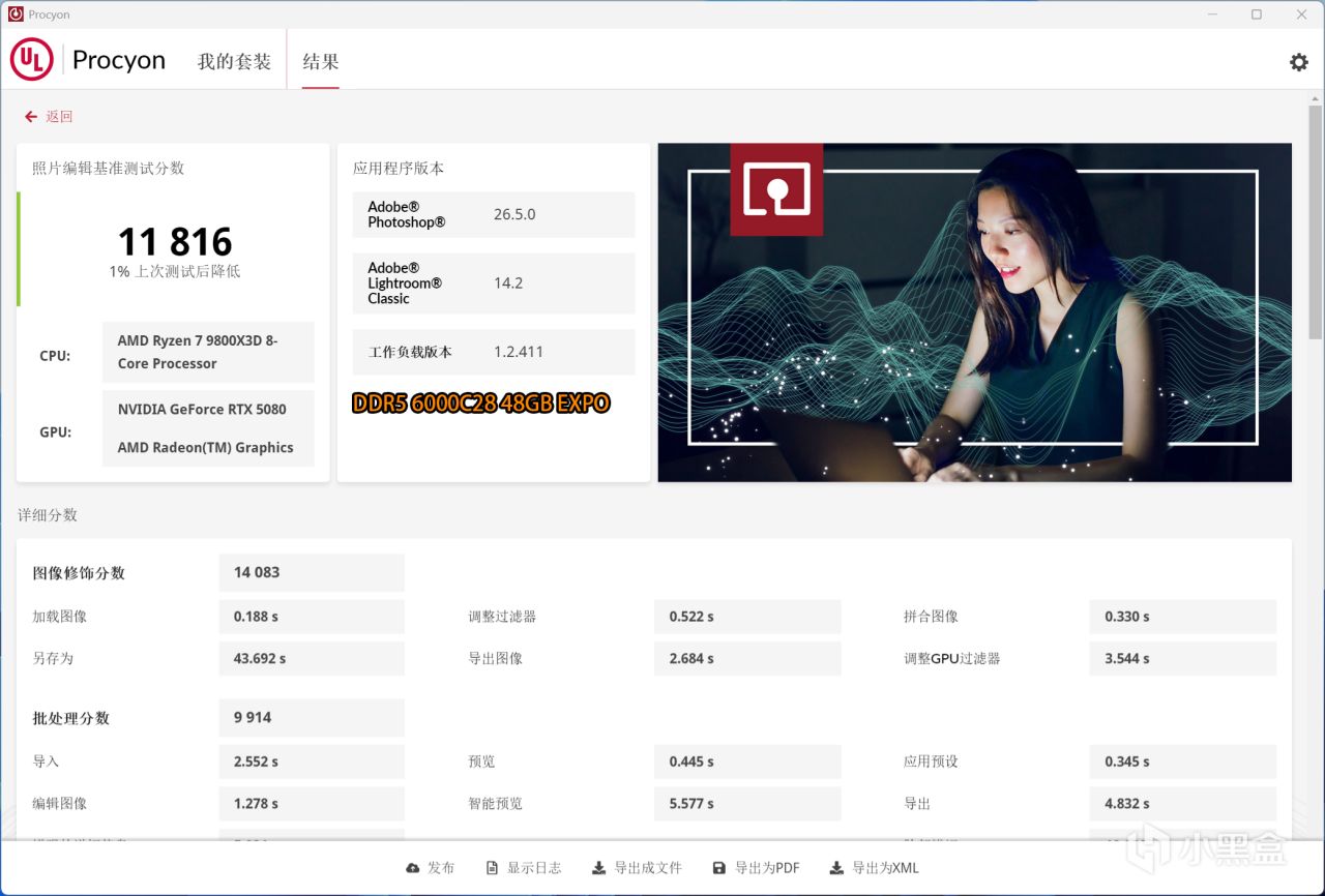 UL Procyon照片编辑,锐龙7 9800X3D+影锋DDR5 6000C28 48GB EXPO得分11816