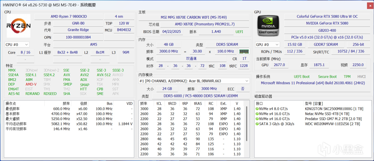 搭配测试CPU是锐龙7 9800X3D,设定为PBO ENABLE状态,关闭SVM虚拟化避免影响分支预测性能,主板是微星MPG X870E CARBON WIFI暗黑,刷至最新BIOS(支持AGESA 1.2.0.3c),搭配显卡是NVIDIA RTX 5080,开放式平台和27℃室温环境。