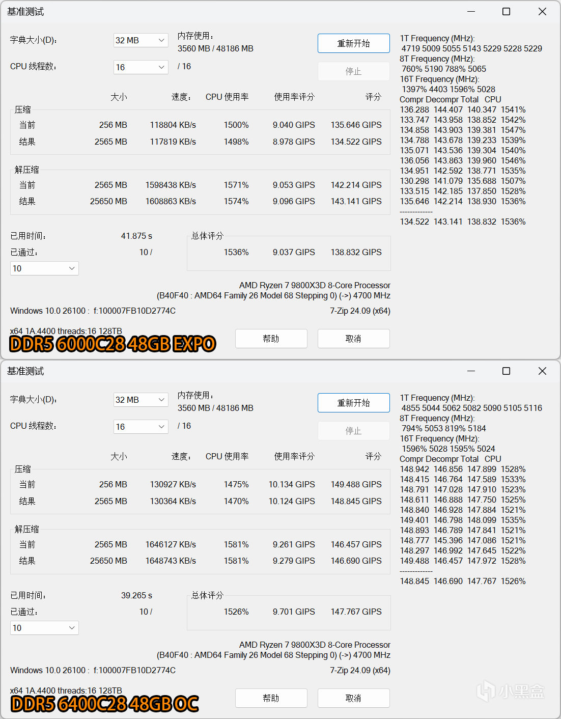7-ZIP基准测试,直接代表着日常压缩和解压缩文件的效率,压缩表现直接和内存性能相关,手动超频后提升幅度可达到11%之多,而解压缩关联CPU本身更多,内存性能影响小一点,手动超频可比EXPO提升2%。