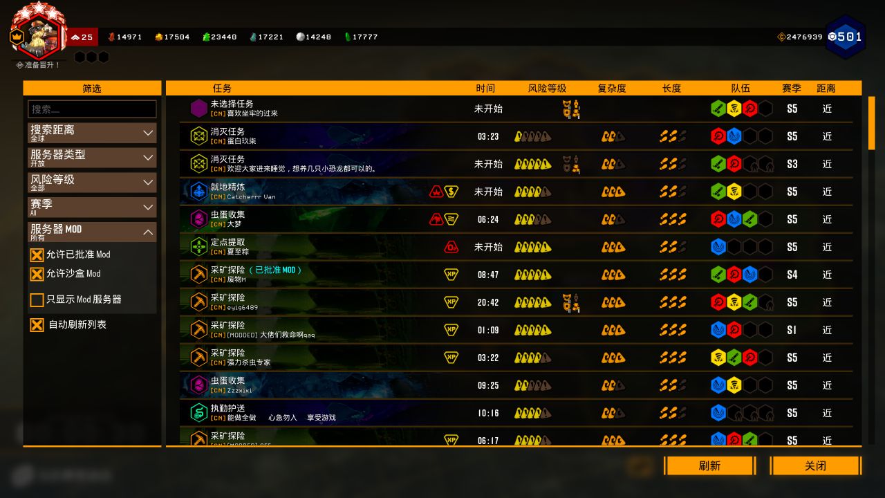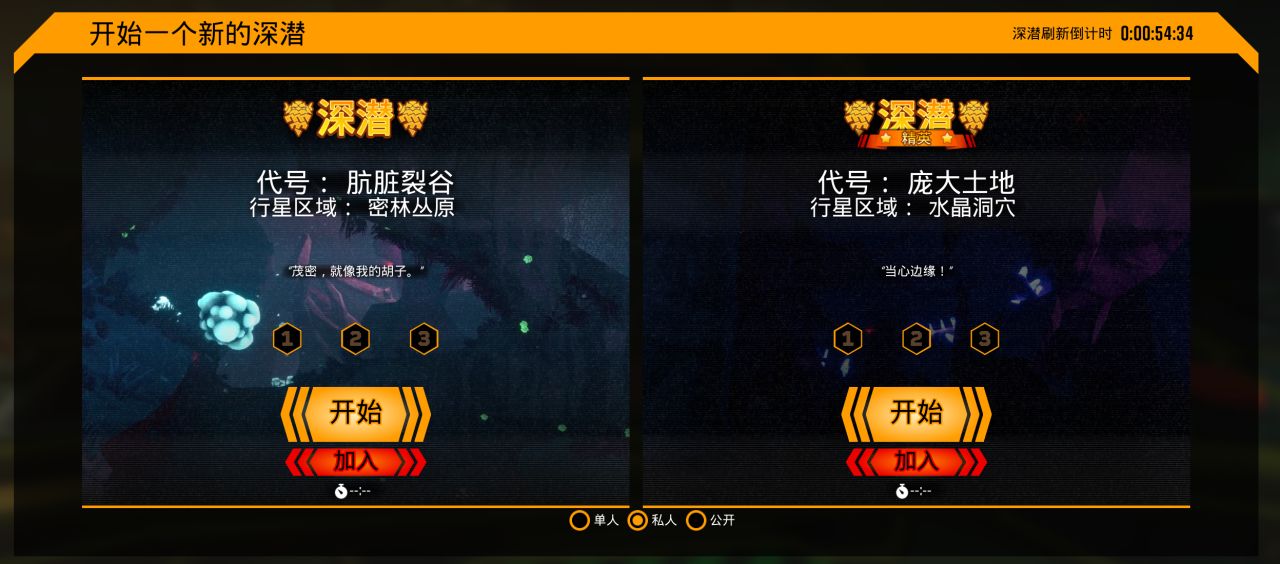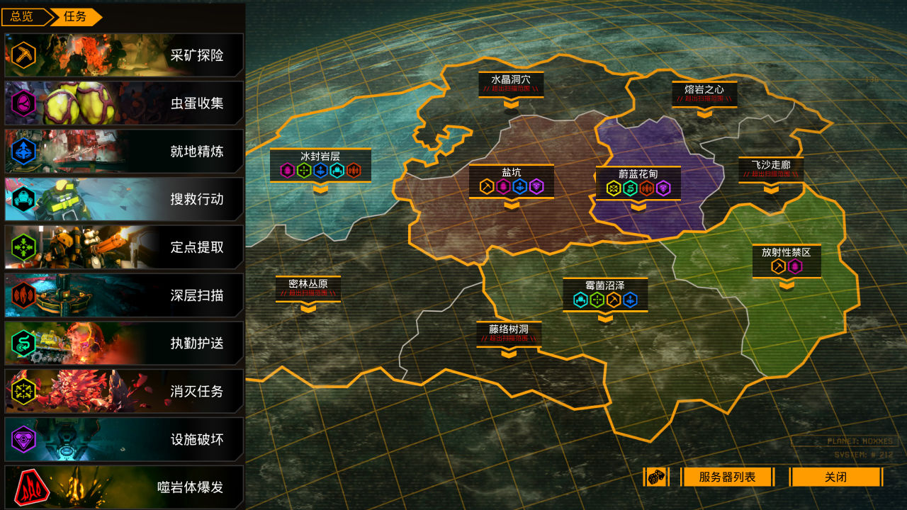 霍克斯星上有着不同的地图环境,不同的任务目标也不同(任务的难度玩家们可自行选择),或是在地图中集齐200的墨菱石后撤回,或是收集地图中的虫蛋,本质上都是在虫潮的围剿下收集齐一定数量的任务目标,安全撤回,获得经验和矿石来提升局外成长(也有像击杀无畏任务这样的类boss战)。