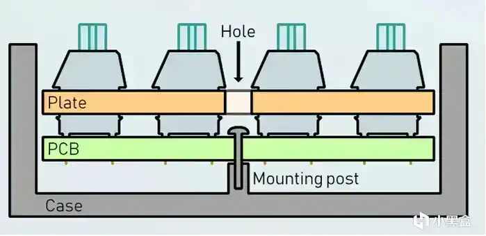 top结构是一种将PCB和定位板直接固定在外壳上的结构,螺丝直接和定位板相连把上下壳连在一起固定,这样子的设计使得定位板悬浮在键盘的内部