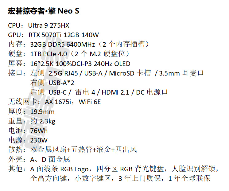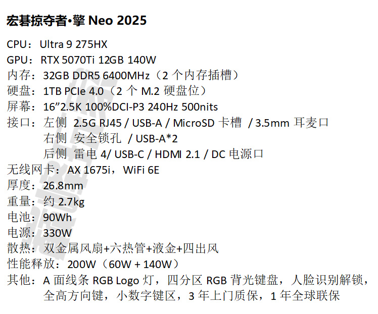 宏碁还同时推出了2款16英寸RTX 5070Ti的掠夺者擎Neo 2025新机。