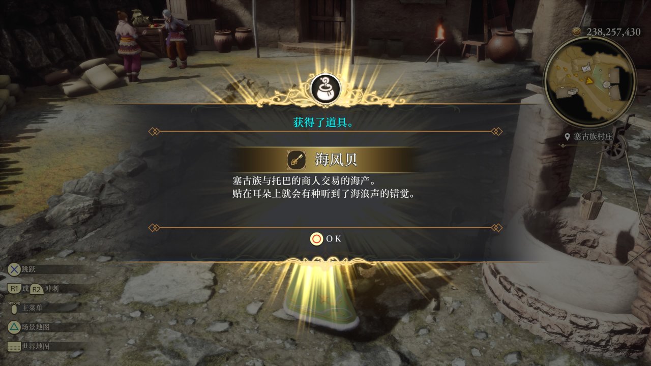回到「塞古族村莊」對話村長交付任務,交付後再次對話得知村長從「託巴」交易獲得一個海螺貝殼,能聽懂海之主的聲音,選擇購買,海風貝之後在海之主任務會使用到。